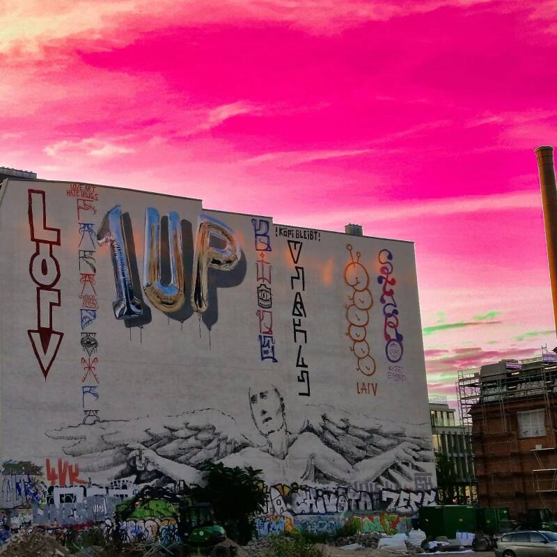 L'image évoque une certaine ambiance urbaine, avec des bâtiments industriels en arrière-plan et les graffitis qui témoignent d'une culture urbaine dynamique. Cependant, le ciel rose et la douceur de la lumière créent une atmosphère plus onirique et romantique.