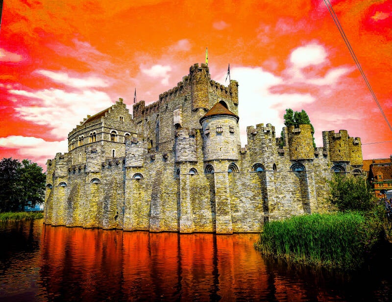 La photo montre le majestueux château des Comtes de Flandre, à Gand (Belgique), avec ses murs de pierre grise se dressant au bord d’une eau rougeâtre, sous un ciel flamboyant aux teintes orangées.